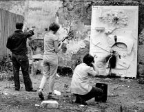 Artistic action: participants (left to right, shooting at pigment sacks hung on tableau): Jean Tinguely, Niki de Saint Phalle, unidentified man kneeling)