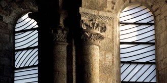 FRANCE. AVEYRON (12) CONQUES, ABBAYE STE FOY. STAINED GLASS PIERRE SOULAGES. TOPS, SYMBOLIC REPRESENTATION OF THE EUCHARIST