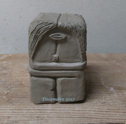 Mes lignes se redéfinissent peu à peu, plus harmonieuses, les aplats, moins bruts,les reliefs plus marqués…Un peu de matière à ôter par ci, encore par là. Les bouches, les yeux à soigner davantage..Puis ce sera le temps du lissage, polissage…