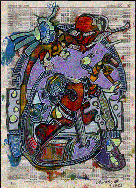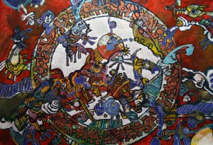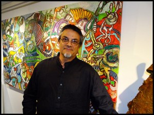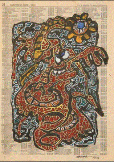 Un monde chatoyant, ludique, parfois végétal, animal, presque mythologique….mais d’où la vie jaillit dans chaque coin de la toile, qui semble s’animer, se mettre en mouvement. Une sollicitation permanente à pénétrer dans un monde merveilleux!