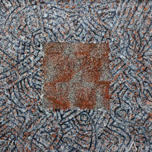 J’en observe avec un infini plaisir et une gourmandise non feinte tous ces détails. Sur l’ensemble des toiles, soigneusement garni de motifs géométriques, aucun espace n’est laissé au vide, pas la moindre trace de toile blanche, nulle part. Toute la surface se peuple, s’anime d’un monde étrange.