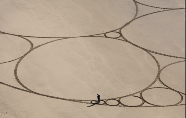 Jim Denevan(ou encore Sam Doulgados sur la Côte Basque, vu sur les plages de #Biarritz) trace infatigablement, avec une infinie patience, mais sans espoir de possession, des cercles, des lignes, des dessins savamment calculés sur les plages de sables fin, que le mer efface inexorablement la marée suivante!