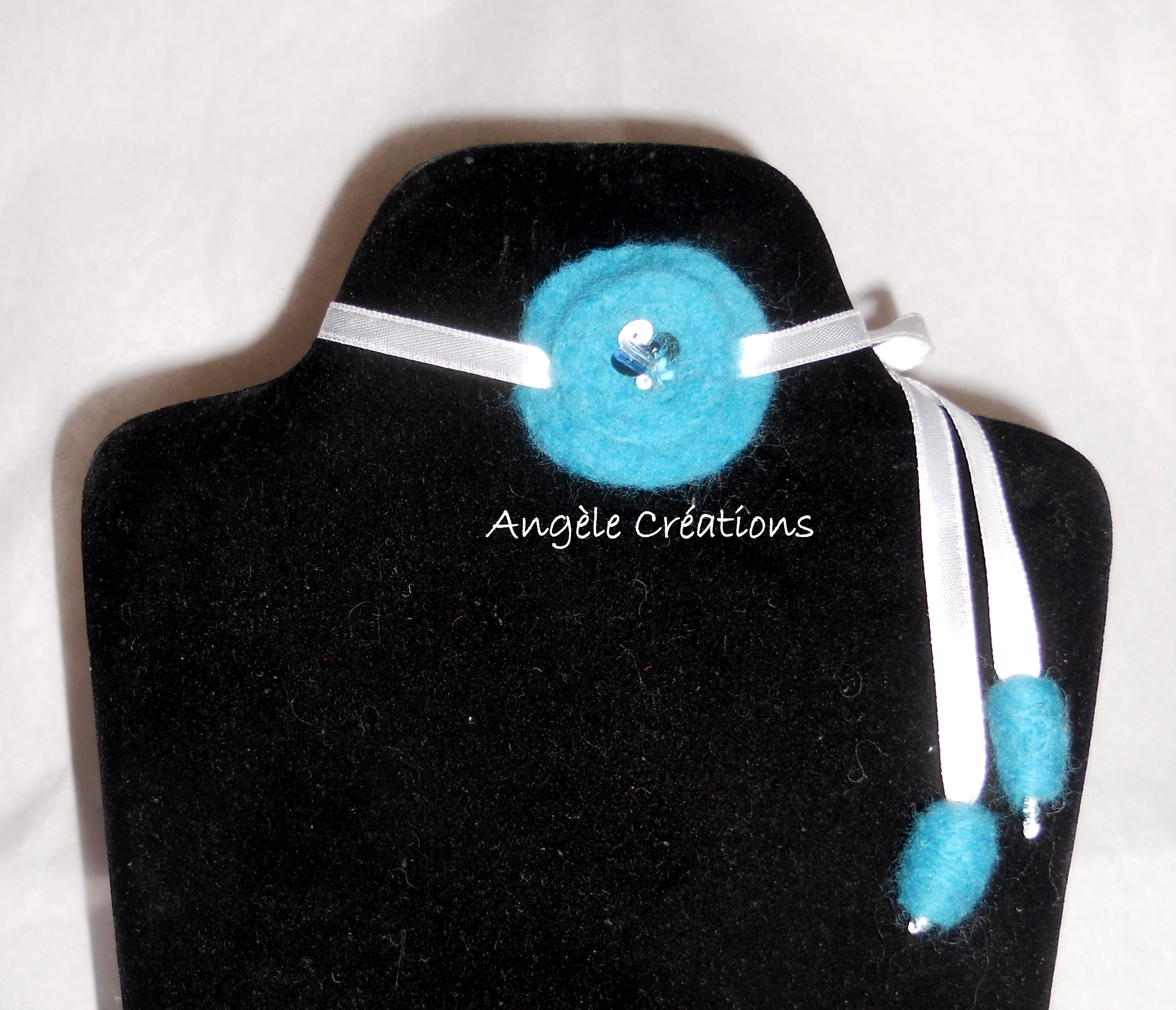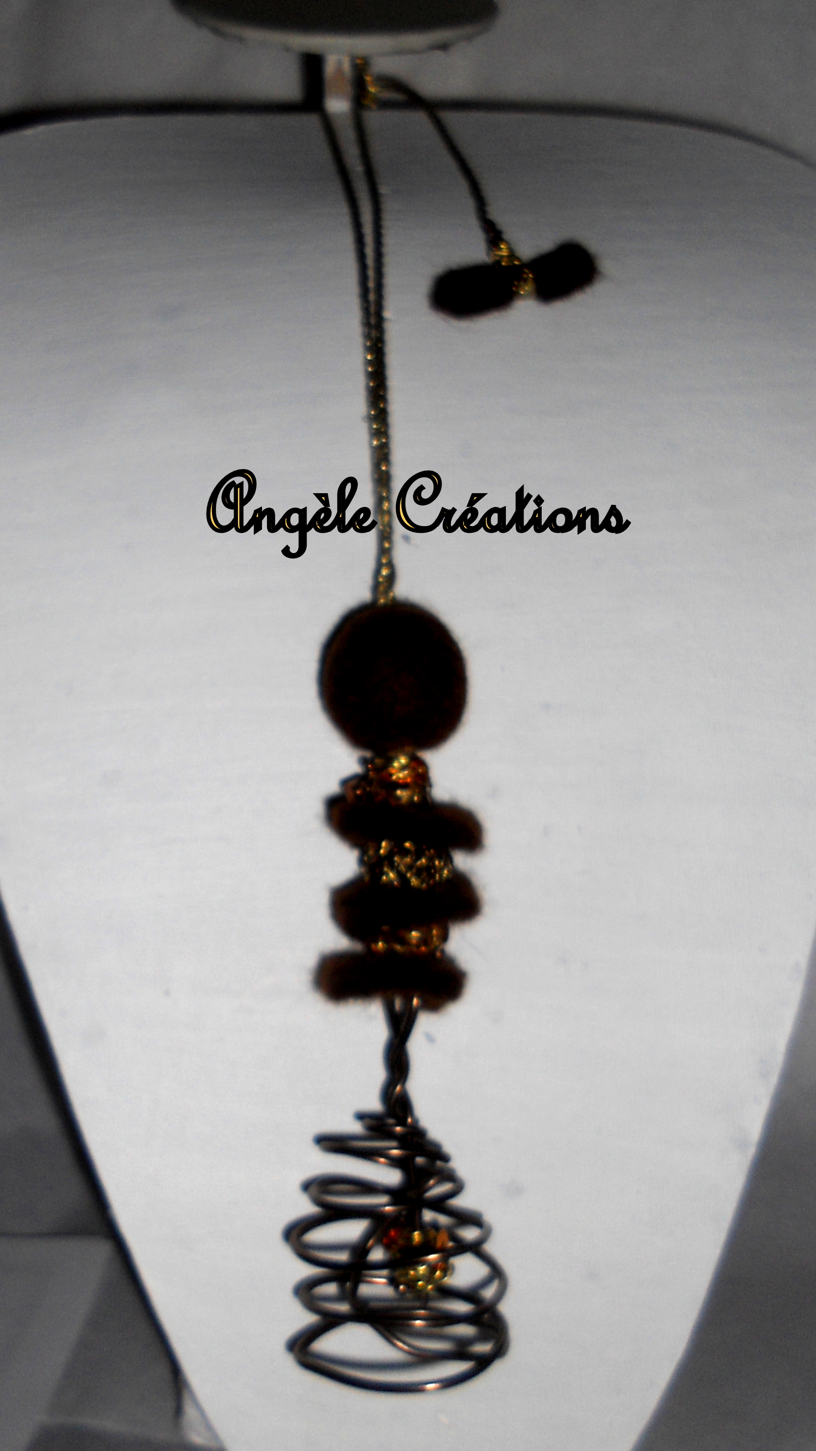 Mon petit dernier un sautoir avec mes perles de laine blanche, faites par mes soins, pâte polymère et un motif « tourbillon » garnie d’une autre perle de laine.