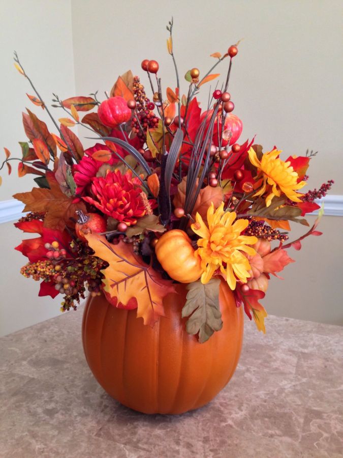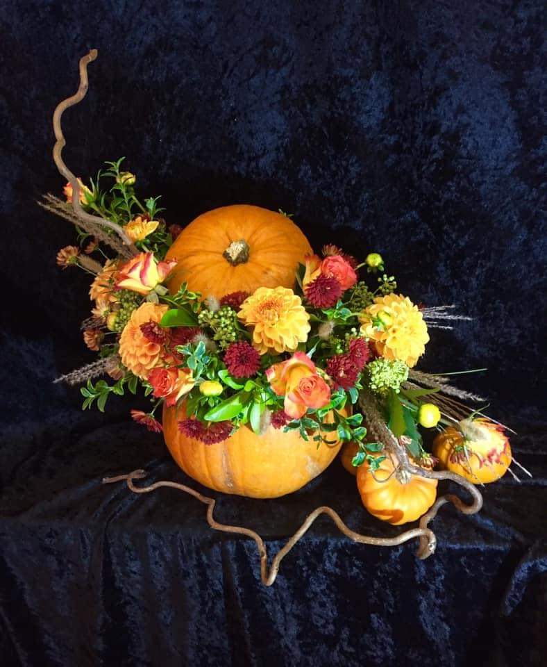 Composition florale en feuillage d’automne dans une ravissante petite citrouille