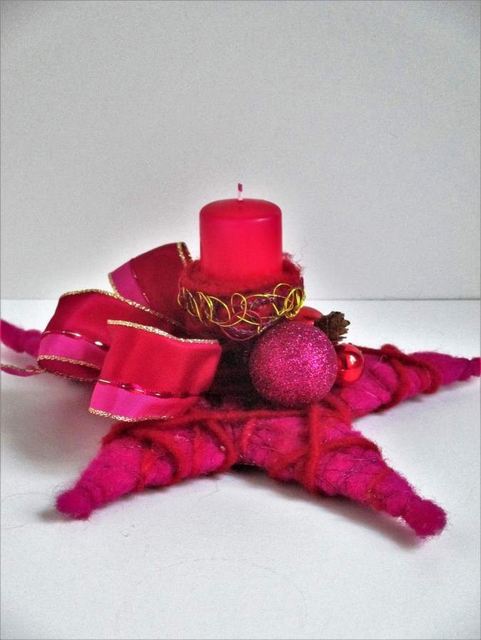 Sophistiquée, par ses #couleurs de #laines vives, cette étoile pourrait donner le ton à votre #décoration de #Noël. Sa #bougie #rouge, le #ruban en taffetas bicolore et #doré, ses boules à paillettes, ses #pommes_de_pin en fond vraiment un #objet décoratif_de_table élégant!